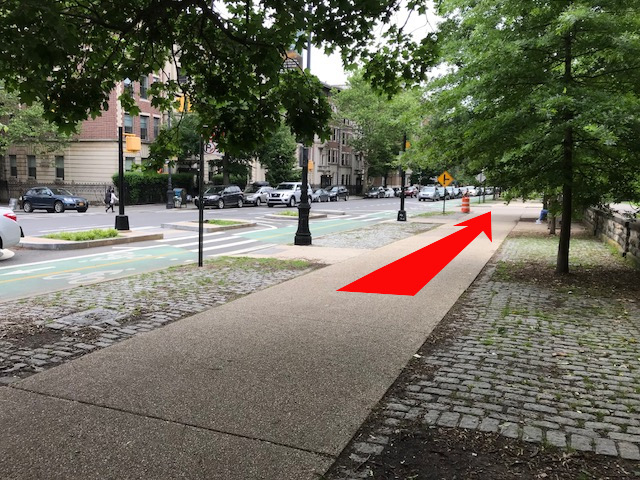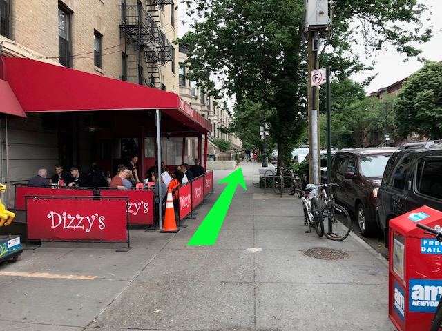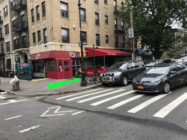 If you see a Starbucks and Smiling Pizza, you got out at the 7th Avenue end of the station and need to walk along 9th Street in the direction the train goes away from Manhattan for one avenue to get to the first picture.